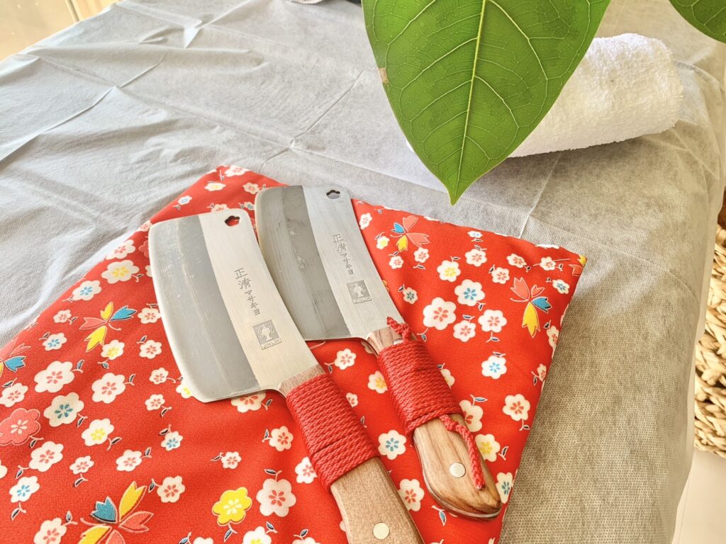 包丁マッサージは、中国の僧侶が始めたと伝わる「刀療(とうりょう)」という民間療法をルーツに持ち、失われた技術が台湾で復活し、現代に受け継がれてきました。切れないよう加工された二本の包丁で身体をリズミカルに叩くことで、全身に振動が伝わり、深部から緊張を解きほぐします。